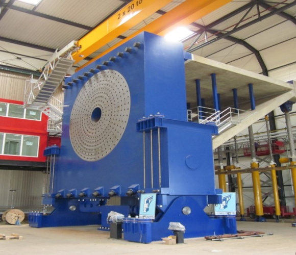 Bau eines Prüfstandes für statische und zyklische Prüfungen von Rotorblättern bis zu 90,00 m Länge. Kippbarer Einspannblock von über 1.000,00 to Gewicht, Abmessungen L x B x H = 14,00 × 12,00 × 12,50 m.