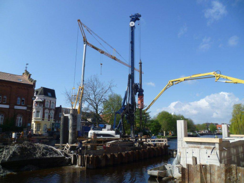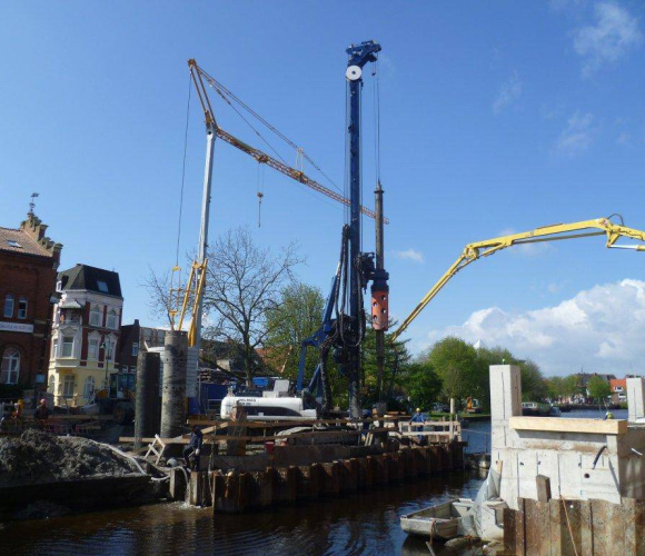 Die erforderliche Gründung für den Unterbau erfolgte mittels Großbohrpfählen. Der Klappen- und Spitzenpfeiler ist in Stahlbetonbauweise hergestellt worden, wobei die Ansichtsflächen eine entsprechende Verklinkerung erhalten haben. Bei der Tragkonstruktion für den eigentlichen Überbau handelt es sich um eine Klappbrücke mit unten liegendem Gegengewicht aus Stahl.