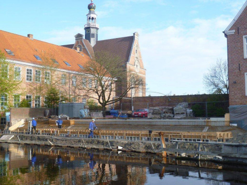Aufgrund der engen, teilweise historischen Bebauung ist eine verankerte Spundwand mit einem Stahlbetonaufsatz zur Ausführung gekommen. Aus gestalterischen sowie aus Gründen des Denkmalschutzes wurde die Ansichtsfläche mit einem nach innen gewölbten Klinkermauerwerk (preußische Kappe) aus Betonfertigteilen hergestellt.