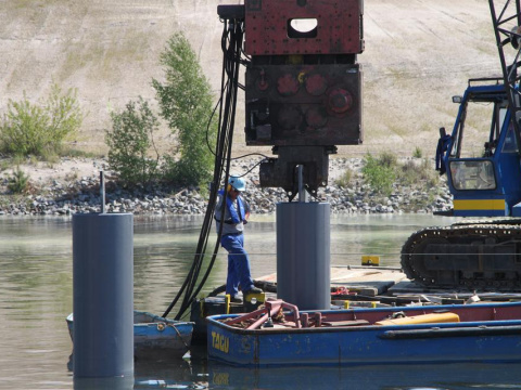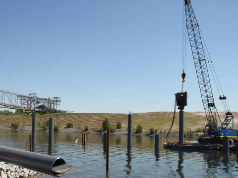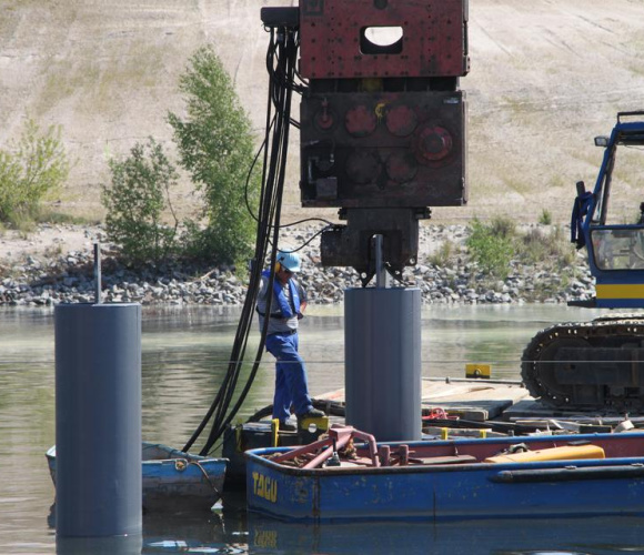 Einbau von 9 Dalben für eine Steganlage auf dem Bergheider See, einem ehemaligen Braunkohletagebau einschließlich An- und Abtransport der schwimmenden Technik über den Landweg über eine eigens hierfür hergestellte Verladerampe am Seeufer.