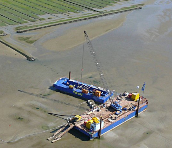 Vorbereitung der Kabeltrasse DolWin2 für den Netzanschluss der Offshore Windparks vor Borkum im Bereich der Kabeltrasse Norderney und durch den Nationalpark Wattenmeer bis Hilgenriedersiel. Unter Berücksichtigung der ökologischen Anforderung einer Baumaßnahme im „Nationalpark Wattenmeer“ gelangten hier zum wiederholten Male die eigens für den Wattbereich entwickelten schwimmfähigen Baugrubenumschottungen zum Einsatz.