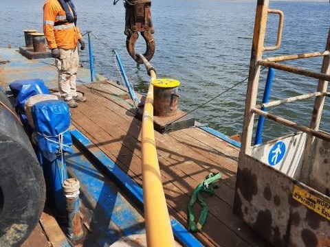 At the end of the pilot hole, with only a couple of joints to be drilled, drilling was halted, to avoid early punch out and deterioration of the mud due to salt water. The following morning, the barge left the Beverwijk port at 5 am, to arrive on site in time for the high tide; Only 2 m above NAP was predicted, barely enough for this barge with the large crane. Once in position, the spuds were lowered, and the hull lifted to avoid it to hithitting the seabed. During this operation, the bit punched out onto the seabed. Air was pumped to unveil that the exit point was indeed as expected, next to the barge.