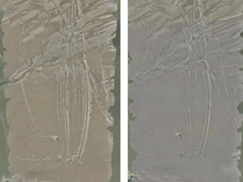 The impact on the tidal flat bottom was documented by drone footage during and after the construction work. Figure 2 below shows the traces in the tidal flats during and immediately after the construction work. It should be said that even the clearest traces of the cable conduits that have run dry are barely visible in the field at a depth of a few millimetres. Nevertheless, it can be seen that even supposedly minor traces do not disappear after a few tidal cycles, but that regeneration only occurs over a period of several weeks or months. After just under four weeks, however, a clear regeneration is already visible (right picture). Since the traces have not significantly changed either the fauna or the discharge behaviour of the tidal flats, it is assumed that the construction work could be completed without lasting environmental damage in this respect.