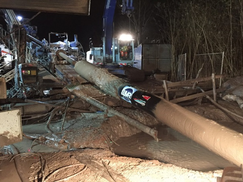 The pipe pulling procedure then started in the early morning of November 11th. It was due to the topographical conditions that 3 pre-aligned partial strands of the product steel pipeline with a length of approx. 580 m each had to be pulled in. The overbend construction was planned for this entry so that it could be welded with little effort in the ridge of the overbend. A special ballast system for the pipe segments was developed by Brochier and LMR. This had the advantage that the welders, inspectors and pipe insulators had such a dry spot in the otherwise very wet terrain. Due to the excellent quality of the borehole, the pullback of the product pipe could be completed without any particularities in the early morning of November 13th. Maximum pull-in forces were < 30 to when tightening the individual pipe segments after the interruptions that were due to the connection of the pre-aligned partial strands of the product pipeline.