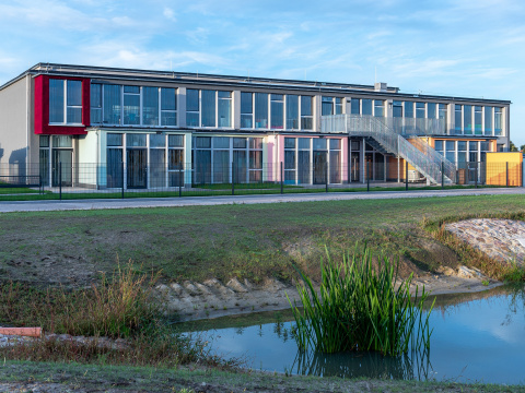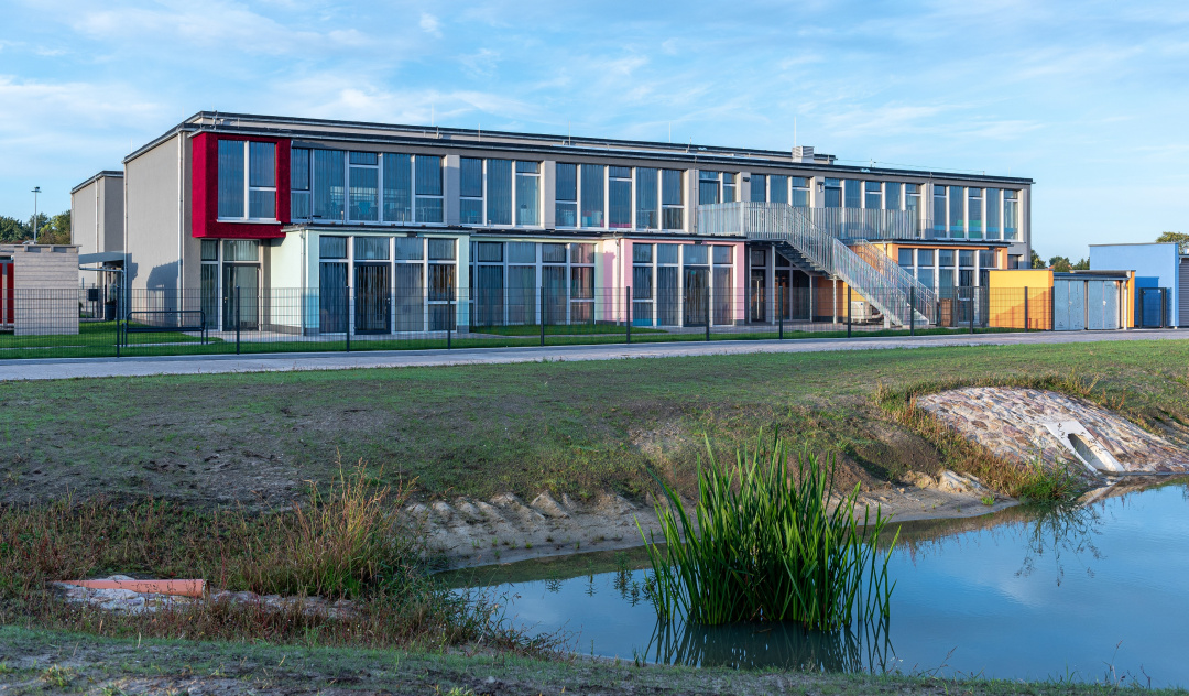 Die Außenansicht des in 16 Monaten entstandenen zweigeschossigen Massivbaus aus Beton und Kalksandstein wird geprägt durch herausgezogene farbige Baukörperbereiche. BPN hat für dieses Projekt die Leistungen zur Tragwerksplanung erbracht.