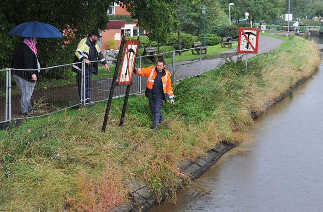 Mittlerweile wurden in dem Schacht zwei Rohre gefunden. Eines, aus dem Wasser strömte, wurde provisorisch verschlossen, sodass nun vorerst kein Wasser mehr auf den Wall läuft.