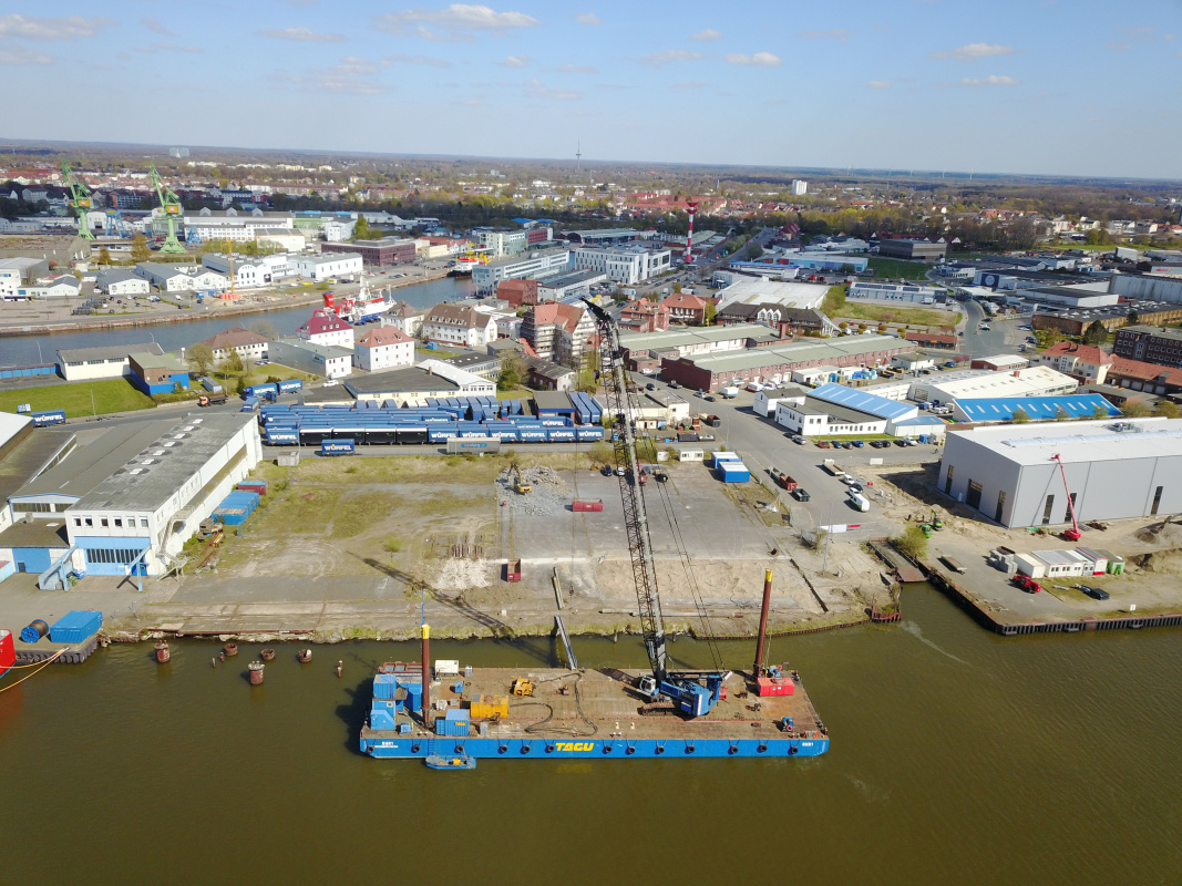 Durch die TAGU Tiefbau GmbH Unterweser erfolgt an der Kaje 28 im Bremerhavener Fischereihafen die Lieferung und Herstellung einer einfach rückverankerten Spundwand auf einer Länge von ca. 310 m im Abstand von ca. 90 cm vor die vorhandene Uferwand. Hierzu gehört auch die Verfüllung des Zwischenraumes sowie die Ausrüstung der Spundwand mit Steigeleitern, Poller usw.
