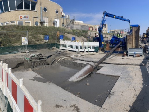 Da die Ausführung der Arbeiten bereits für Februar 2021 vorgesehen war, wurde um Unterstützung von unserer Seite gebeten, um sicherzustellen, dass die Genehmigungen rechtzeitig vorliegen würden. Obwohl der Vertrag noch nicht unterzeichnet war, begann LMR aufgrund des vertrauensvollen Miteinanders mit den Detailplanungen. Da der in Großbritannien ansässige Kunde von dem irischen Ingenieurbüro MDM vertreten wurde, war die Unterstützung unserer niederländischen Mitarbeiter bei den Vorbereitungen sehr willkommen. Wir halfen bei der Einholung der Genehmigungen und bei der Information der örtlichen Behörden und anderer Beteiligter, um sicherzustellen, dass unsere Bauarbeiten den normalen Betrieb so wenig wie möglich stören und beeinträchtigen würden, denn die Einrichtung der Baustelle erfolgte auf dem Hauptparkplatz für die Besucher des Strandes in IJmuiden, und unsere Ausrüstung würde eine beträchtliche Anzahl von Parkplätzen einnehmen. Auch gab es bereits frühzeitig Absprachen mit dem Unternehmer für die Verlegung des Offshore-Kabels, um die Schnittstellen zu klären, wie z. B. die Rückholung des Offshore-Endes des später einzubauenden Datenkabels und weitere Details der damit verbundenen Arbeiten. Während der Detailplanung wurde noch der Umfang der Arbeiten angepasst, wobei die Hauptaufgabe in dem Einbringen eines 40 m langen HD-PE-Rohres DN 125 als seeseitige Verlängerung des Kabelschutzrohrsystems im Offshore-Bereich bestand.