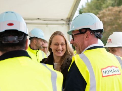 Vor Ort waren stellvertretend für Homann Feinkost GmbH zwei der Geschäftsführer Markus Dominik Hauck und Burim Ganijaj, außerdem Landrätin Anna Kebschull, Bad Essens Bürgermeister Timo Natemeyer, Fachdienstleiterin des Bauamtes Silke Bulthaupt und Ortsbürgermeisterin von Lintorf Silke Depker, stellvertretend für Freytag & v.d. Linde Geschäftsführer Mariusz Kupka, Projektleiter Heinrich Borgolte und Bauleiter Finn Renken-Sigl.