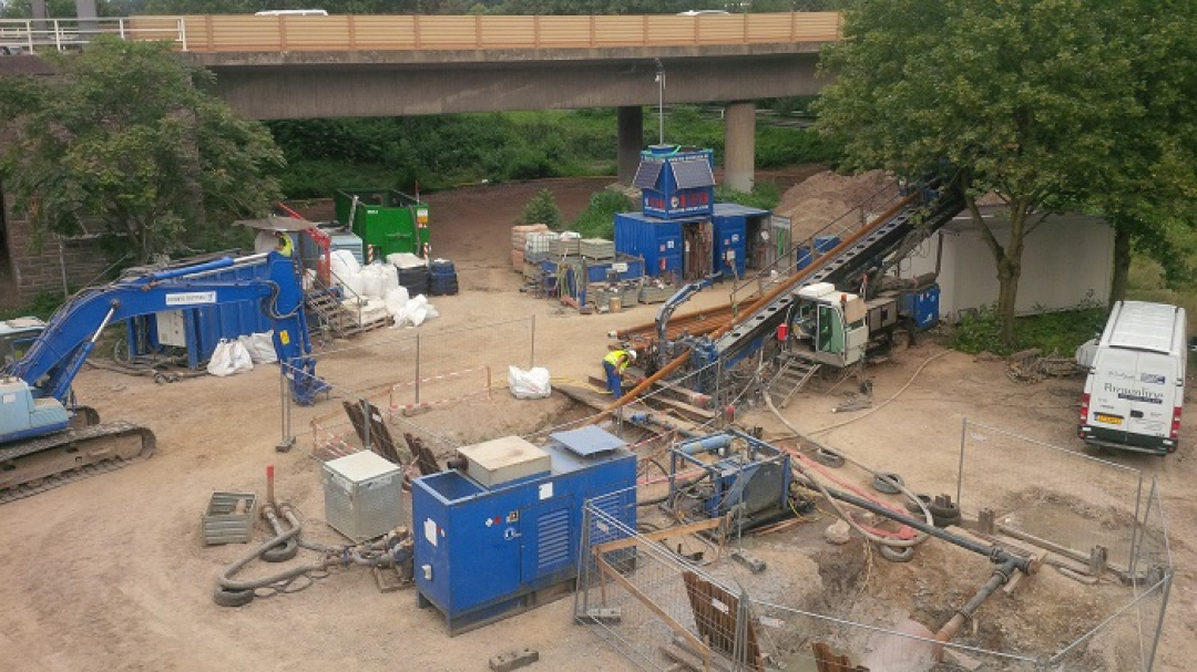 Nach Abschluss der Ausführungsplanung und der Bauvorbereitung begannen Anfang Juli 2016 oberhalb des rechten Rheinufers die Arbeiten zum Einbau der Stahlschutzrohre durch einen von LMR beauftragten Subunternehmer. Auf Grund von Bahnauflagen sollten Rohre DN 800 im Bohrpressverfahren ohne vorauslaufendes (Fels-)Bohrwerkzeug installiert werden. Nach Erreichen des Felshorizonts war es so aber nicht mehr möglich, das Schutzrohr weiter in den Tonstein einzubringen und den Bahnbereich vollständig zu unterqueren. Setzungsmessungen am Gleis zeigten zu diesem Zeitpunkt allerdings keine Veränderungen, was erheblich zur Beruhigung der beteiligten Bahnüberwachung beitrug. Dennoch musste eine Lösung gefunden werden, um eventuelle Ausspülungen unter dem Bahnkörper zu verhindern. Nach Zustimmung der Bahn entschied der Auftraggeber, ein von LMR vorgeschlagenes Zementationsverfahren zum Verfestigen der Ortsbrust durchzuführen und nach Rohreinzug ein Stahlhülsrohr über das Produktrohr in das aufgeweitete Bohrloch zu schieben. Gleiches galt für das zweite DN 800 Stahlschutzrohr, das im Anschluss installiert wurde.