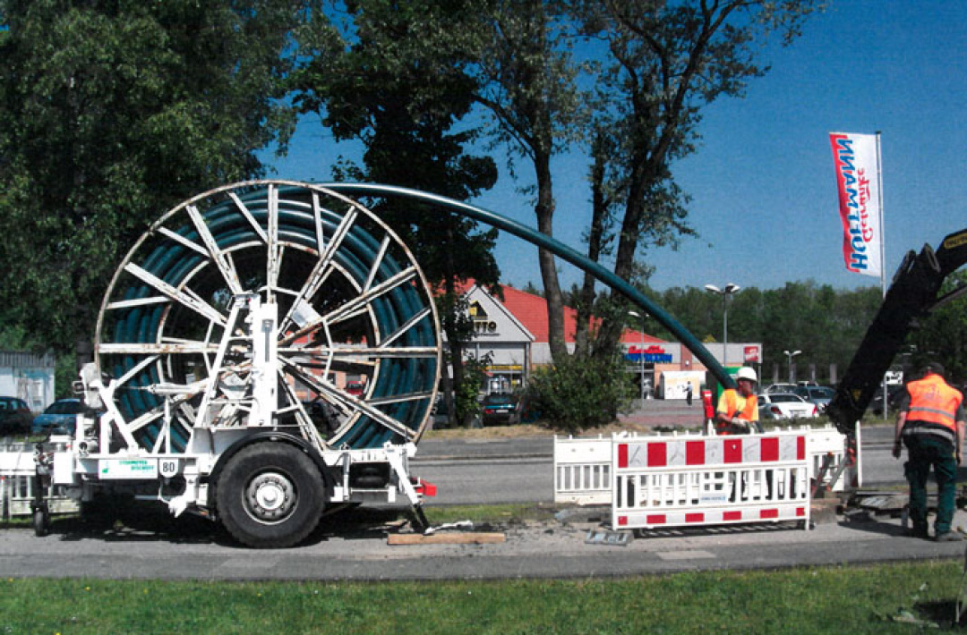 Bei diesem Verfahren wird handelsübliches PE – HD Granulat zu einem endlosen Strang extrudiert, im warmen Zustand in die benötigte C – Form gefaltet und auf Trommeln gewickelt auf die Baustelle geliefert. Die Herstellung erfolgt nach der DIN 8075/8075 und unterliegt den Güteschutzanforderungen der DIN 50049/2.1.